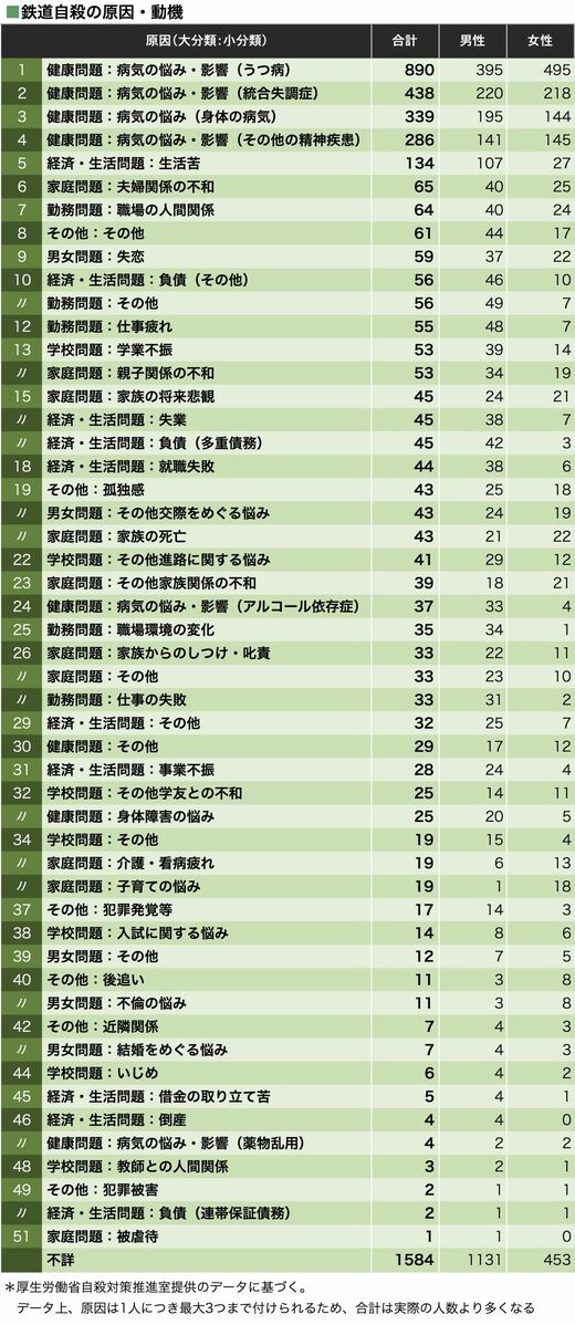 ビジネス #鉄道最前線 前の記事 次の記事 鉄道自殺、最多の原因は「健康問題」だった 過去7年分の自殺原因や性別・職種を集計 4分で読める 公開日時:2016/10/28 05:00 佐藤 裕一 ジャーナリスト(日本不審者情報センター) フォロー 1/4 PAGES 2/4 PAGES 3/4 PAGES 次ページが続きます:【職業別の自殺原因は】 4/4 PAGES