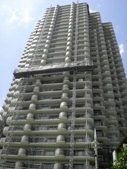 総工事費の3割超を占めると言われる作業足場の世界では、組み立て式の仮設足場に代わる選択肢として、移動昇降式やブランコ式が注目されている。組み立て式は前述のように、マンションの周囲をすべて足場で囲い、シートやネットで覆うやり方だ。