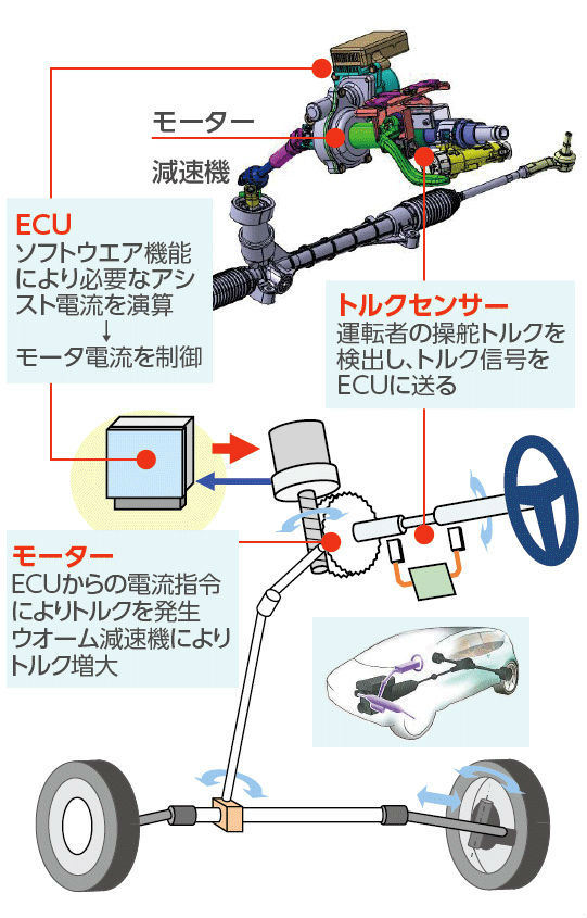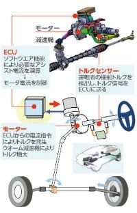 EPSの場合は、ここに3つの要素部品が付け加わる。ハンドルに加えられた力(トルク)を検出する「トルクセンサー」と、センサーが検出したトルクや車速などの車両情報をもとにアシスト力を計算する「ECU(電子制御ユニット)」、そして、ECUの演算結果を物理的な力に変換する「モーター」の3つだ。すなわち、「ハンドル」と「トルクセンサー」は入力装置として働き、「ECU」は演算装置として、「モーター」は出力装置として機能する。これが、EPSのおおまかな全体像だ。