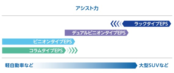 ラックEPSとピニオンEPSは、どちらもラック&ピニオンの動きをアシストするものだが、よりタイヤに近い下流のラックタイプの方が、高い出力を得やすく、中~大型車向けのEPSとして、市場の拡大が見込まれている。これまで中~大型車には、高出力と操舵性能を得やすい油圧式パワーステアリング(HPS)が使われることが多かったが、環境性能へのニーズの高まりと、EPSの技術の進展により、ラックタイプ搭載車が増えているためだ。