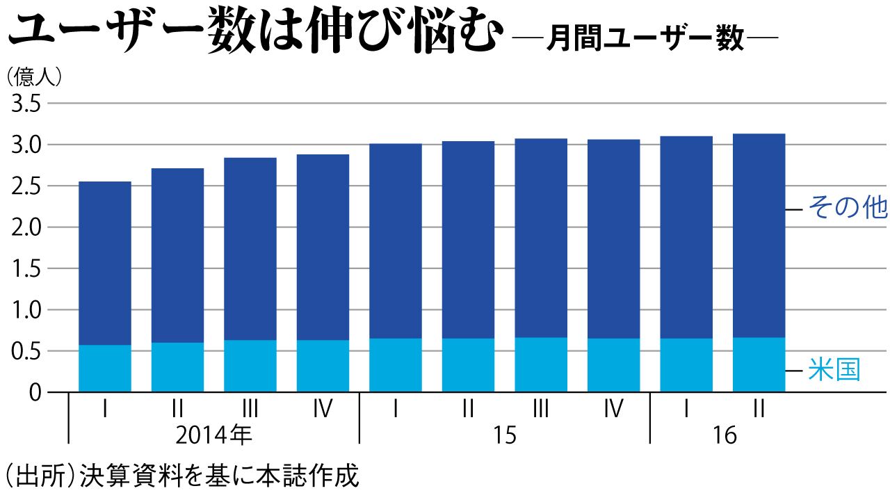 その一方、本国の米国では、2015年前半に月間ユーザー数が6500万人に到達して以降は完全に伸びが止まった。世界全体でも3億人を超えたあたりで、成長スピードが鈍化している。