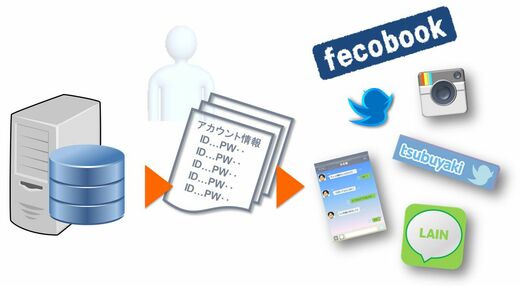 SNSを乗っ取ろうとする連中は、ネット上のいろんなサービスの中から、セキュリティ体制の甘いサーバーを探し出して侵入。保存されている利用者情報(ID・パスワードなど)を、バレないようにゴッソリ抜き取ります。