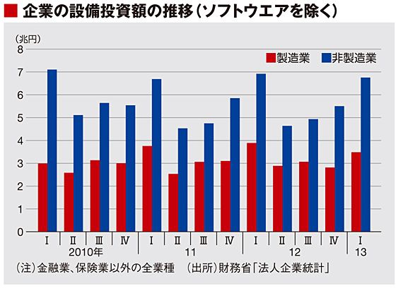 6月3日に公表された2013年1~3月期の法人企業統計の数字は、設備投資が増えていないことをはっきりと示している。