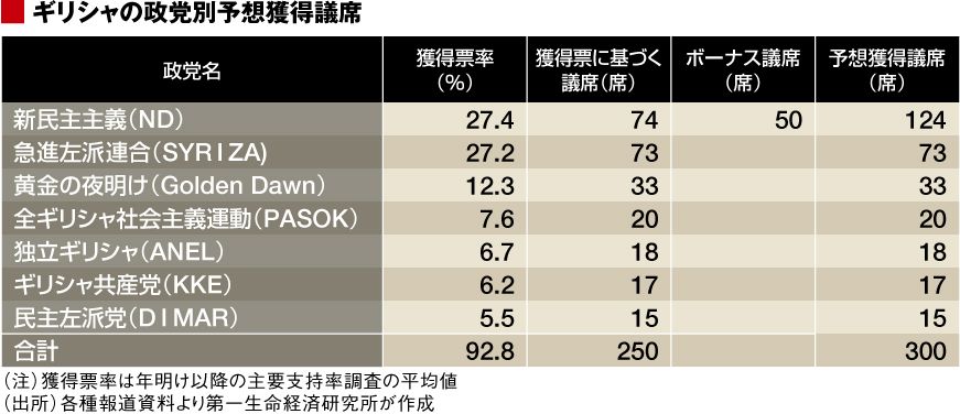 ギリシャの議会選挙は比例代表制で定数は300議席、①獲得票率が3%未満の政党は議席を獲得することができない、②3%以上の票を獲得した政党の間で、それぞれの獲得票率に応じて250議席を配分する、③安定した政権運営を行うことを目的に、最大票を獲得した政党に50議席のボーナスが与えられる。