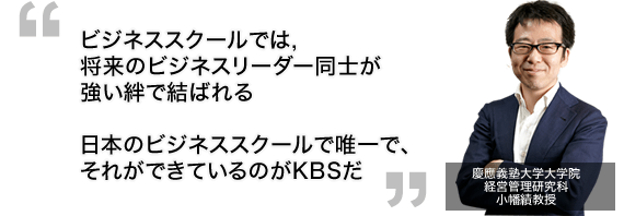 KBSで教鞭を執る小幡績准教授は「ビジネススクールはビジネススキルやツールだけを学ぶ場ではない。損得勘定抜きで、ビジネス、公私共に付き合える一生の友を作る場所でもあるが、KBSなら、それができる」という。