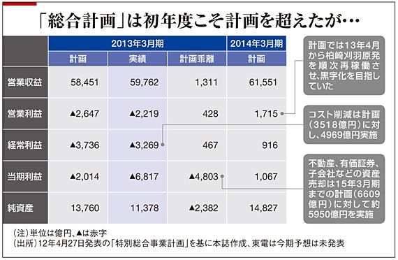 同社は昨年4月末、将来的な道筋を示す「特別総合事業計画」(総合計画)を策定、14年3月期には営業黒字化を達成すると発表していた。が、これはあくまで柏崎刈羽原発7基のうち4基が今年4月から順次再稼働した場合の数字だ。