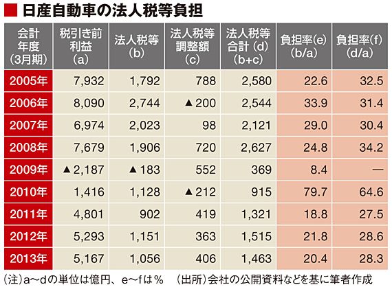 以上で述べた問題を考慮にいれた上で法人税負担を見るには、いくつかの方法がある。もっとも直接的な方法は、個別企業について、決算書の数字から負担率を計算することだ。表は、日産自動車についての法人税等の負担を示したものである。