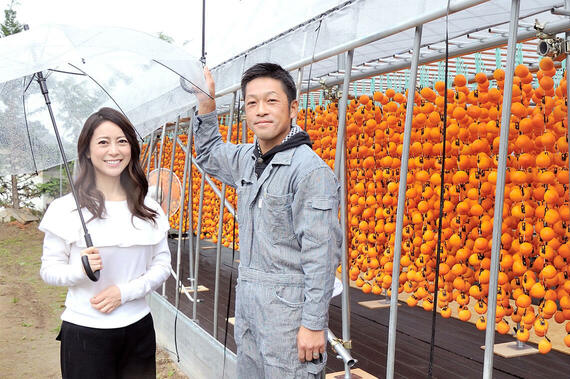 魚住さんが次に訪れたのが本島靖之さんの一家だ。自宅を訪れると敷地内の大きなビニールハウスには干し柿がのれんのように干されていた。文字通り「柿のれん」と言われるその様子は実に美しい。魚住さんも「きれいですね」と言いながら、しばらく見とれていた。