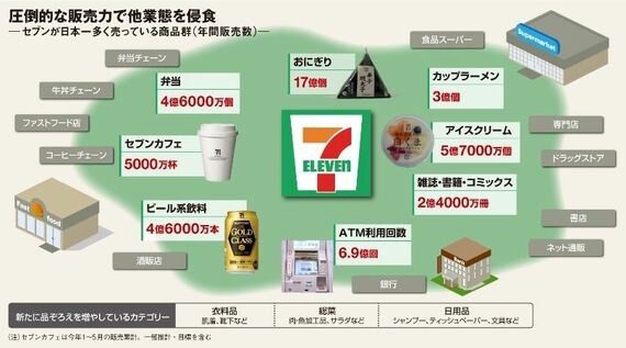 国内で約1万5000店という圧倒的な店舗網を誇るセブン。日本一の販売量を誇る商品は数多くある。ほかにもソフトドリンクの年間販売本数26・3億本など、専用商品に限らずメーカーのNB(ナショナルブランド)商品を売る力も強大だ。