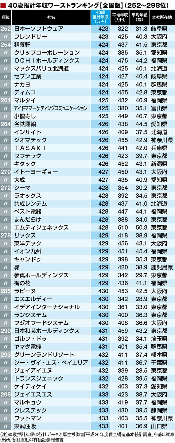 政治・経済・投資 #賃金・生涯給料ランキング 前の記事 次の記事 40歳年収「全国ワースト500社」ランキング 上場企業でも300万円未満は20社 2分で読める 公開日時:2016/11/28 05:00 東洋経済オンライン編集部 フォロー 1/11 PAGES 2/11 PAGES 3/11 PAGES 4/11 PAGES 5/11 PAGES 6/11 PAGES 7/11 PAGES 次ページが続きます:【301~350位は?】 8/11 PAGES 9/11 PAGES 10/11 PAGES 11/11 PAGES