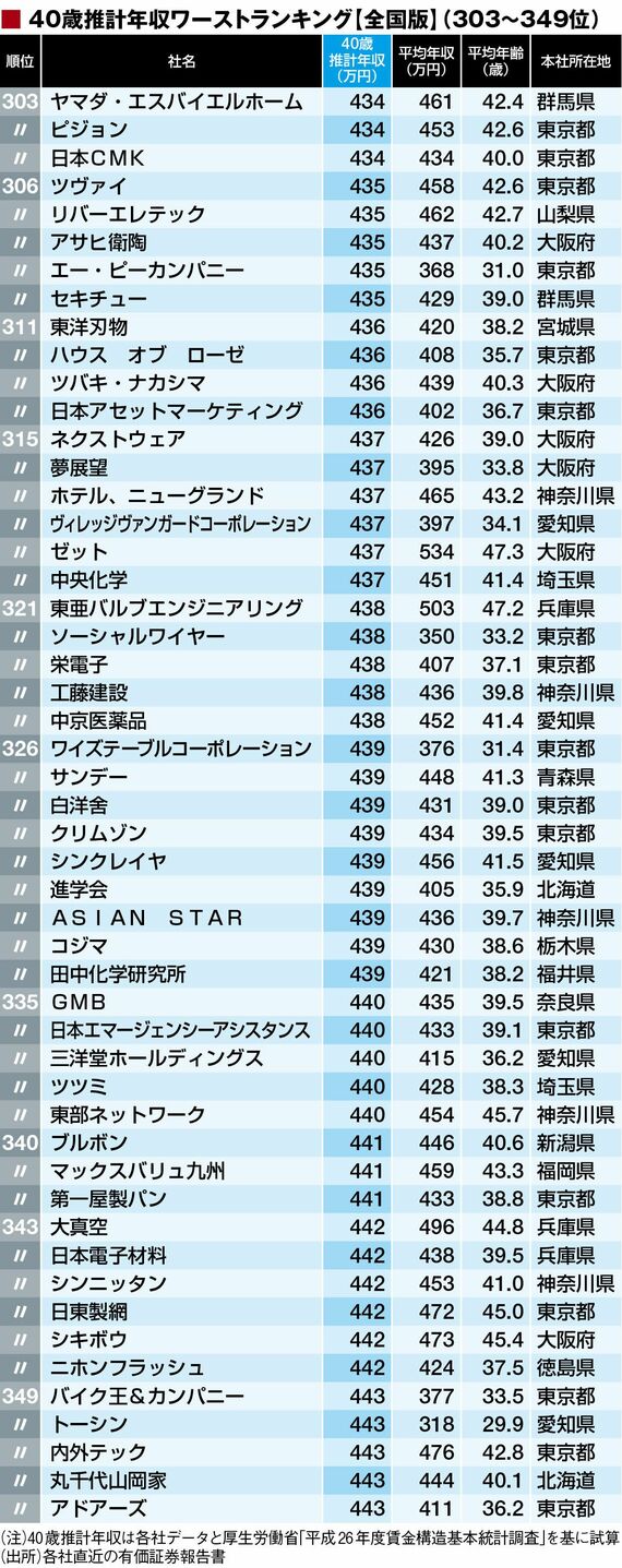 政治・経済・投資 #賃金・生涯給料ランキング 前の記事 次の記事 40歳年収「全国ワースト500社」ランキング 上場企業でも300万円未満は20社 2分で読める 公開日時:2016/11/28 05:00 東洋経済オンライン編集部 フォロー 1/11 PAGES 2/11 PAGES 3/11 PAGES 4/11 PAGES 5/11 PAGES 6/11 PAGES 7/11 PAGES 8/11 PAGES 次ページが続きます:【351~400位は?】 9/11 PAGES 10/11 PAGES 11/11 PAGES