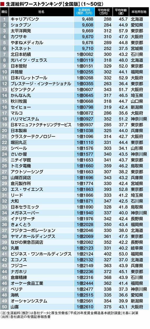 政治・経済・投資 #賃金・生涯給料ランキング 前の記事 次の記事 生涯給料「全国ワースト500社」ランキング 1億円未満は6社、業績不振企業の姿も 3分で読める 公開日時:2016/11/30 05:00 東洋経済オンライン編集部 フォロー 1/11 PAGES 2/11 PAGES 次ページが続きます:【続いて51~100位】 3/11 PAGES 4/11 PAGES 5/11 PAGES 6/11 PAGES 7/11 PAGES 8/11 PAGES 9/11 PAGES 10/11 PAGES 11/11 PAGES