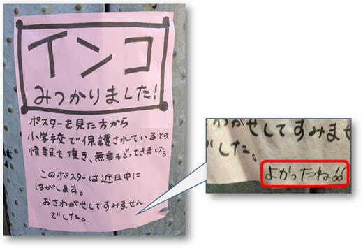 「この貼り紙のお陰で戻ってきました」ですって。しかもまったく知らない通りすがりの誰かが「よかったね」というコメントまで……たぶん貼り紙を剥がすとき、飼い主も気が付いてますよね。人と人とを結び付けたうえにインコまで戻ってきて、しかも誰かの「よかったね」まで伝えている・・・。これは、もう完全にSNSです。