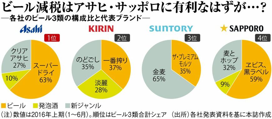 2015年9月に旧「モルツ」を刷新し、「ザ・モルツ」を投入。続いて、キリンが主力「一番搾り」の派生品を、サッポロが高価格帯「ヱビスビール」をリニューアル。業界首位のアサヒも「スーパードライ」の不調を受け、3月に「ザ・ドリーム」を投入するなど、各社はビール比率の向上を進めている。