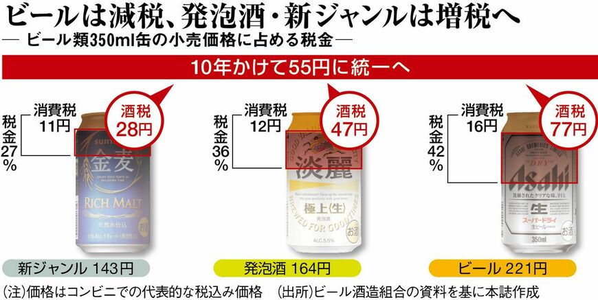 だが、今回の税制改正大綱では、2020年10月から3段階で税率を変え、2026年に1缶当たり55円程度に統一する方向とみられる。アサヒグループホールディングスの小路明善社長は「ビール税の早期改正を要望する」と語気を強めるが、想定以上に時間がかかる感は否めない。