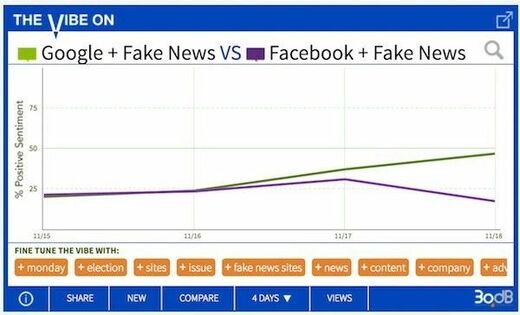 PR合戦でグーグルが勝ちを収めているのは、プレスにおいてだけではない。30dbによる下記のグラフが示すのは、選挙以降、偽ニュースがオンラインで言及されはじめたとき、グーグル関連の内容は、フェイスブック関連の内容よりもポジティブであることが多かったというデータだ。