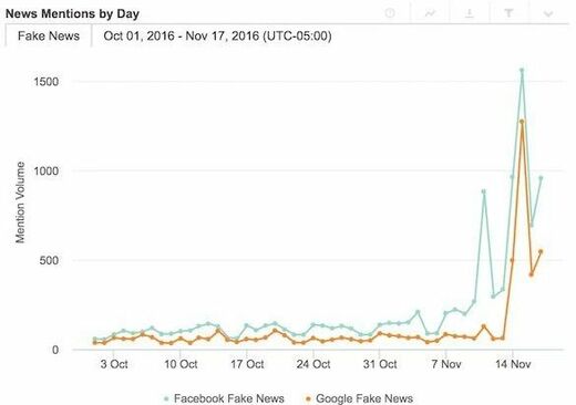 ブランドウォッチのデータによると、「偽ニュース(fake news)」という言葉は選挙以降、さらに頻繁にプレスで使われるようになった。メディアでは、グーグルよりもフェイスブックの方が、多く言及されているようだ。