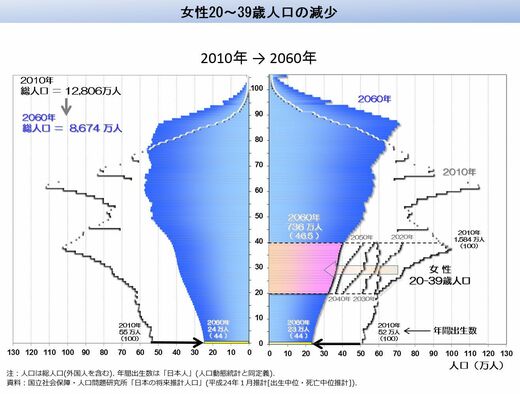 いちばん外の枠が2010年でその世代の女性は1584万人います。でも2060年には、736万人で、2010年の46.5%と半分以下になるのです。