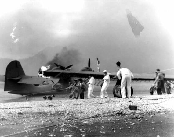 12月6日、米マサチューセッツ州の第二次世界大戦博物館で、1941年12月7日の日本軍による真珠湾攻撃を報告する電報と、当時ウェストポイントの士官学校にいたドワイト・アイゼンハワー氏の息子が攻撃後に父に助言を求めた書簡が展示され、当時の衝撃ぶりが改めて明らかになった。写真は攻撃を受けて燃える軍用機PBYを救助するようす。提供写真(2016年 ロイター/U.S. Naval History and Heritage Command)