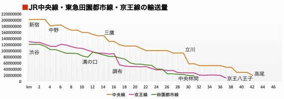 途中駅での増減はあるものの、最もシンプルな「ターミナル駅から乗ったときが一番混んでいる」タイプなのはJR中央線・京王線・東急田園都市線だ。京王線は多摩ニュータウン・橋本方面への相模原線が分岐する調布(新宿から約15キロメートル)、中央線は立川(約27キロメートル)でガクッと輸送量が減る。このあたりまで来ると「車内が空いたな」と感じるのではないだろうか。