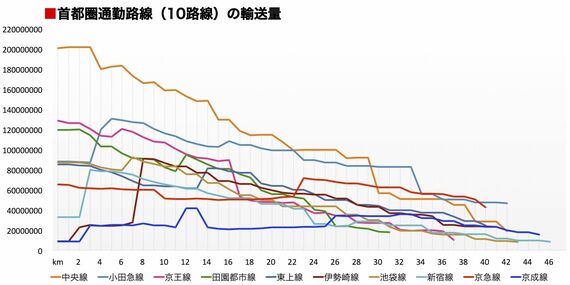 だが、起点から約30キロメートル付近の輸送量を見ると、この順位はだいぶ変わってくる。多い順に小田急線>JR中央線>京急本線>東武東上線>東武伊勢崎線>京成本線>西武池袋線>西武新宿線>京王線>東急田園都市線の順となり、ターミナル駅付近では3番目に輸送量が多かった田園都市線は最下位となっているのだ。