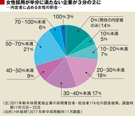 最も多いのは「ほぼ変わらない」が65%で、「女性比率が下がった」という回答も8%あった。意図的に比率を高めるべきだったという意見もあるが、その意味は「2017年卒でできなかった」という趣旨の反省だ。