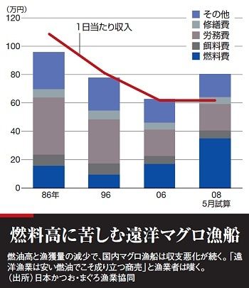 マグロ水揚げ高で国内2位を誇る神奈川県三崎港。遠洋マグロはえ縄漁船を7隻保有する「事代漁業」の寺本紀久社長は「オイルショックのときより厳しい」と表情を曇らせる。同社は太平洋でキハダを中心に獲っており、航海中は一度も寄港せず給油船に頼る。この海上補給代が、キロリットル当たり12万円と2年前に比べ倍増した。「8万円のときから赤字が続く」と寺本社長はため息をつく。しかも漁獲量は減少傾向。以前は1年未満だった航海期間も、現在は最長15カ月ほどに延びている。