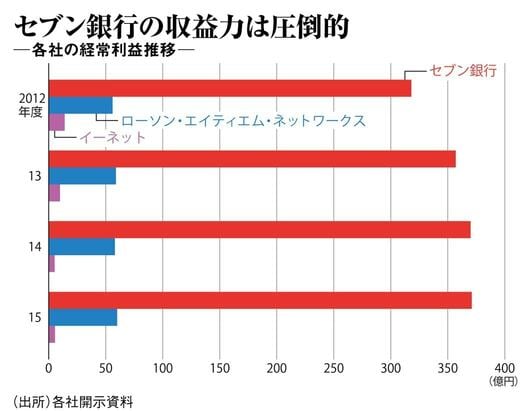 セブン&アイにおいて金融部門は存在感を増している。同社傘下のセブン銀行の2015年度経常利益は371億円。一方、ローソンのATMを運営するローソン・エイティエム・ネットワークス(LANs)は同60億円、ファミリーマートのATMを管理するイーネットは同5.5億円にとどまる。