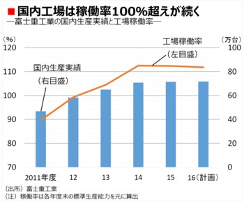 富士重工業の主力市場・米国では、今年1~11月の販売台数が55万台を超え、年間での過去最高更新も射程に入ってきた。しかし国内や米国の工場をフル稼働させても、世界各地で顧客が納車まで約3カ月も待たされている。2012年度以降は国内工場の稼働率が100%を超えたままだ。