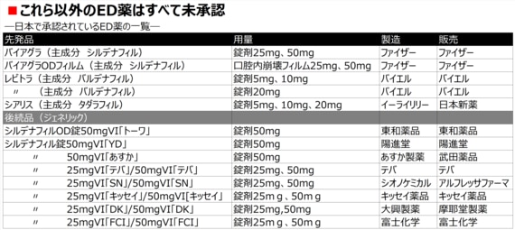 ED薬をはじめとする処方薬は、正規の成分が正規の用量含まれていたとしても、使う人によっては大きなリスクを伴う。狭心症治療でニトログリセリンを服用している患者の場合、ED薬の成分と相乗効果を発揮してしまい、急激な血圧低下を招くことがある。承認以上の大用量であったり、まして未知の成分が含まれていた場合、体調が急変しても原因がわからず医師も対処のしようがない。厚生労働省のホームページにも偽造ED薬が原因と見られる脳血栓(治癒)や間質性肺炎(死亡)の事例が報告されている。