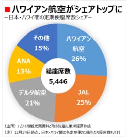 ここにハワイアンの成田、羽田の新路線が重なり、シェアトップの座が入れ替わったのだ。座席の供給量は大幅に増えたが、「年末年始の予約率は昨年並みを維持している」(ハワイアンの宍戸隆哉・日本支社長)という。