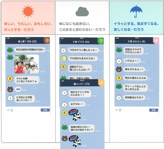 教室で生徒一人ひとりに配られるのは、LINEのトーク画面を模した5枚のカード。仲良し6人のグループで遊びに行く約束を交わすもの、クラス全員(30人以上)が加入しているグループでその日のテストについて振り返るものなど、シチュエーションはさまざまだ。
