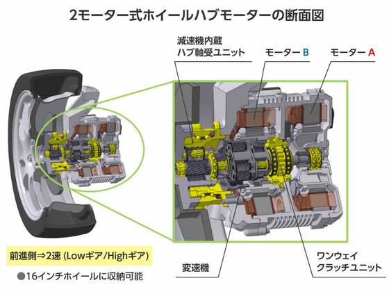 動作メカニズムは、おおむね次のとおりだ。駆動力に優れたLowギアでは、外側のモーターBを後退方向に回転させ、ワンウェイクラッチと変速機の働きで、出力軸の回転数を抑えつつトルクを増幅し、力強い加速を実現する。加速中にギアをHighに変えると、外側のモーターBの反転と、内側のモーターAの回転数減少が同時に進行する。2つのモーターが進行方向に同じ回転数になると変速は終了し、2つのモーターが必要最小限の電力でホイールを高速回転させる。