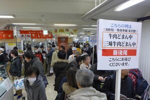 10時開店の直前に到着すると、京王百貨店の入り口から壁沿いに大通りの方までおよそ200人近い列が続いていた。「開店します」の声と同時に大勢の客がエレベーターに向かう。駅弁大会開催期間中は、朝のうちは大会会場の大催場がある7階までノンストップなのでストレスはない。