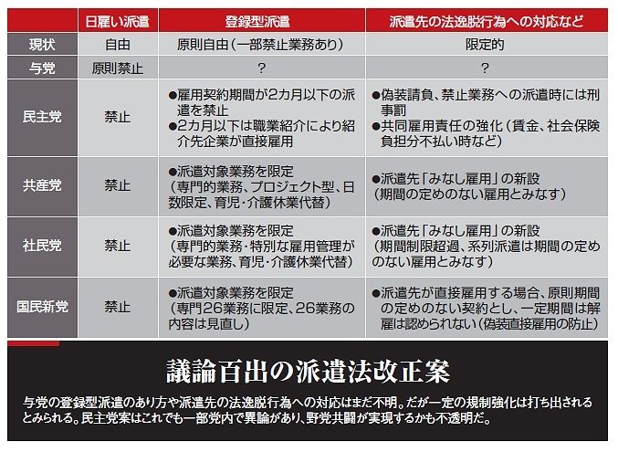 政治の世界では目下、派遣法改正に関して議論が百出している(下表参照)。大阪高裁の判断と近いのが、派遣先「みなし雇用」の新設を掲げる共産党、社民党の改正案や偽装直接雇用の防止を主張する国民新党の主張だ。この3党は対象業務を専門業務等に限定することを主張している。一方、民主党はユーザーへの刑事罰の新設や、雇用契約が2カ月以下の派遣の禁止を主張。抜本転換を求める3党と「政権を担っても提出できる法案」(幹部)とする民主党の主張との溝は深く、通常国会で野党からの改正案提出は見送られた。ただ、与党案が提示される「秋の臨時国会が派遣法改正の大きなヤマになる」(福島みずほ社民党党首)。