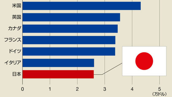 サービス業における1人あたり総生産を見ると、G7の平均が3万8193.3ドルであるのに対して、日本は2万5987.6ドル。これはG7諸国の中でも最下位で、イタリアにも劣っています(2015年、米国中央情報局データより、人口は直近)。