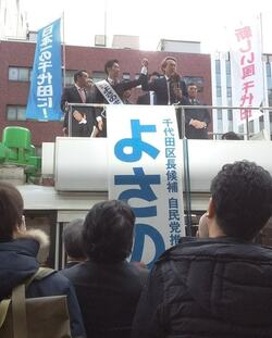 街宣車の上で挨拶したのは、自民党東京都連所属の国会議員のほか、与謝野陣営の選対本部長なども含めて10人にも上る。叔父の馨氏からも激励の電報が寄せられ、披露された。