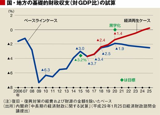 もし財政健全化目標を取り下げるか達成年次を延期すればどうなるだろうか。今年1月の内閣府の「中長期試算」にある国と地方を合わせた基礎的財政収支の対GDP比の推移を見ると、名目経済成長率が3%後半で推移すると見込む経済再生ケースで、2020年度の基礎的財政収支は対GDP比で1.4%(8.3兆円)の赤字である。