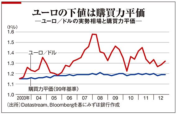 それどころか、今は堅調といってよい動きだ。この謎の答えについて、みずほ銀行マーケット・エコノミストの唐鎌大輔氏は、「ユーロの『円化』が進んでいる」と見る。すなわち、「ユーロは対ドルで、インフレ率の格差を反映して通貨の価値が上がっているのではないか。歴史的に見ても、ユーロの対ドル相場は購買力平価が底値で、そうであれば、1ユーロ=1.20ドルが底値。今後、物価の格差が開いていくとすれば、むしろ『実体経済が悪いからユーロは堅調』という相場になっていくのではないか」というのだ。