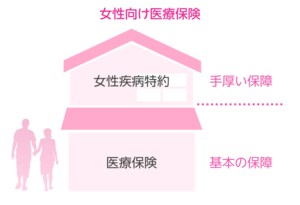 通常の医療保険を1階建てとすると、女性特有の疾病に限って手厚く保障する女性向け医療保険や女性疾病特約は、2階建ての2階部分ということになる。