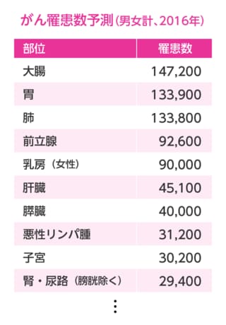 国立がん研究センターがん対策情報センターが発表した「2016年のがん統計予測」によると、2016年の女性のがん罹患数予測は43万4100例。部位別で見ると、乳がんが9万例でトップとなっている。女性の「罹患(新たにがんと診断される)数」の多い部位はまず「乳房」であり、「大腸」「肺」「胃」はその後に続き、30代後半から40代にかけての罹患率は男性を上回る。