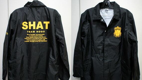 こちらの写真をご覧いただきたい。問題のジャンパーは中国製のシャカシャカする素材で、黒地の左胸に黄色いエンブレムをあしらっている。「悪」という文字の上に、江戸時代に罪人らを召し捕る道具として使われた「刺股(さすまた)」を交差させた勇ましいデザインだ。縦長の逆三角形で縁取るデザインや色合いは警察のエンブレムに似ている。ローマ字で「保護なめんな」と入っている。
