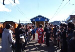 改札口から新金谷駅ホームに続く道が花道となる。クラッカーを鳴らす参列客も(筆者撮影)