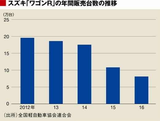 ところが、ここ最近は販売台数の縮小が続いている。2012年9月に登場した先代の6代目ワゴンRは初めて通年販売となった2013年こそ約18万6000台(同約1万5500台)と販売目標至近で推移したものの、2014年は17.5万台(同約1万4000台)へ低下した。さらに年を追うごとに販売台数は縮み、2016年は約8万1000台(同約6700台)とモデル末期だったとしても、発売当初に掲げた目標の半分にまで落ち込んでいた。