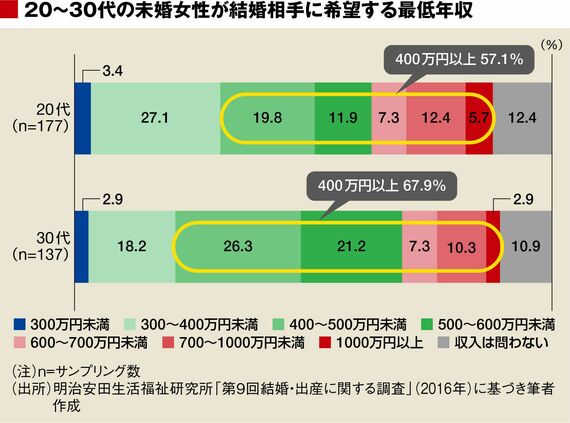 そもそも、女性は結婚相手としての男性にどれほどの年収を期待しているのでしょうか。未婚女性が結婚相手に求める最低年収として400万円以上と回答した割合は、20代で57.1%、30代で67.9%でした。しかし、実際に未婚男性のうち年収400万円以上の人がどれくらい存在するかをご存じでしょうか。20代ではわずか15.2%、30代でも37.0%にとどまり、女性が期待する男性の年収の水準と現実では、大きなギャップがあります。