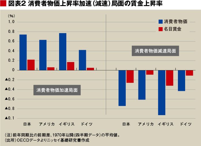 名目賃金上昇率を物価上昇局面と物価下落局面に分けてみると、いずれの国でも物価上昇局面では賃金も上昇するが、上昇率は消費者物価よりも低い。逆に、物価下落局面では名目賃金も下落するが、下落率は消費者物価よりも小さい(図表2)。このことは物価上昇局面では実質賃金が低下し、物価下落局面では実質賃金が上昇する傾向があることを意味する。