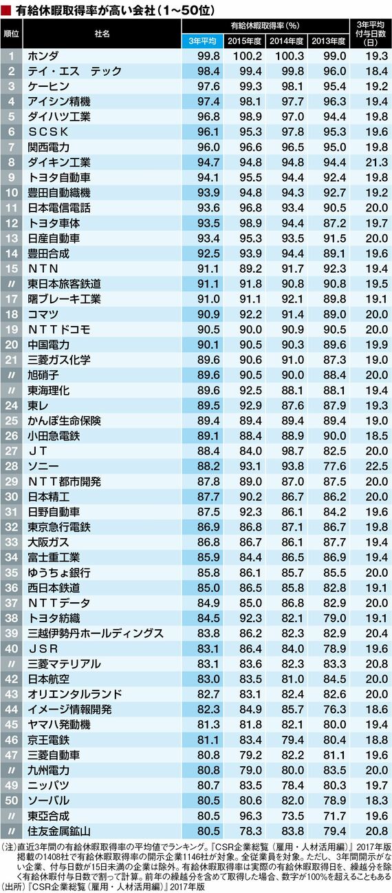 2位はホンダ系の四輪シート部品メーカー、テイ・エス テックで、昨年の3位から順位を上げた。平均取得率も98.4%と昨年の97.0%から1.4ポイント高まった。同社ではホンダ同様、有給休暇繰越カットゼロの取り組みを進めていることに加え、2012年4月からは半日単位の有給休暇制度をスタートさせた。
