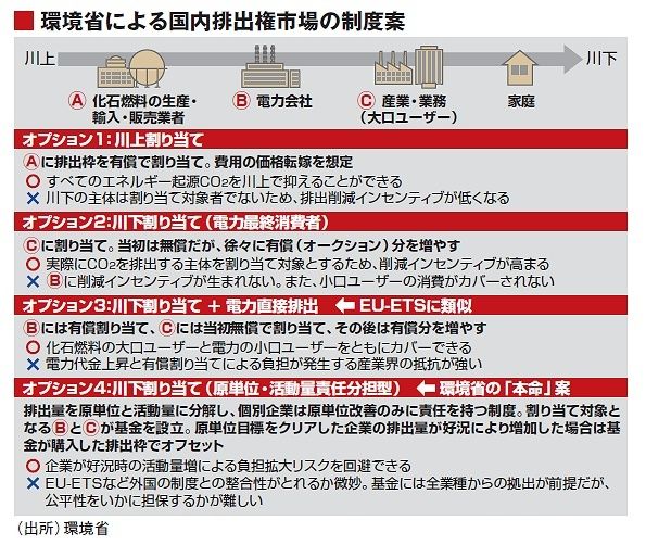ほかのオプションにも、それぞれ一長一短がある。欧州排出権取引制度(EU−ETS)に最も近いオプション3を導入したいのが環境省の本音だろうが、現実的な落としどころとしてはオプション4が本命とされた。