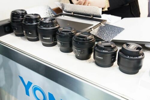 中国の用品メーカーYONGNUOのブースでは、同社の主力製品であるストロボやラジオスレーブ、LEDライトに加え、近年力を注いでいる交換レンズ群を展示。35mm、50mm、100mmという単焦点のラインナップであり、マウントはキヤノン用やニコン用が用意されている。