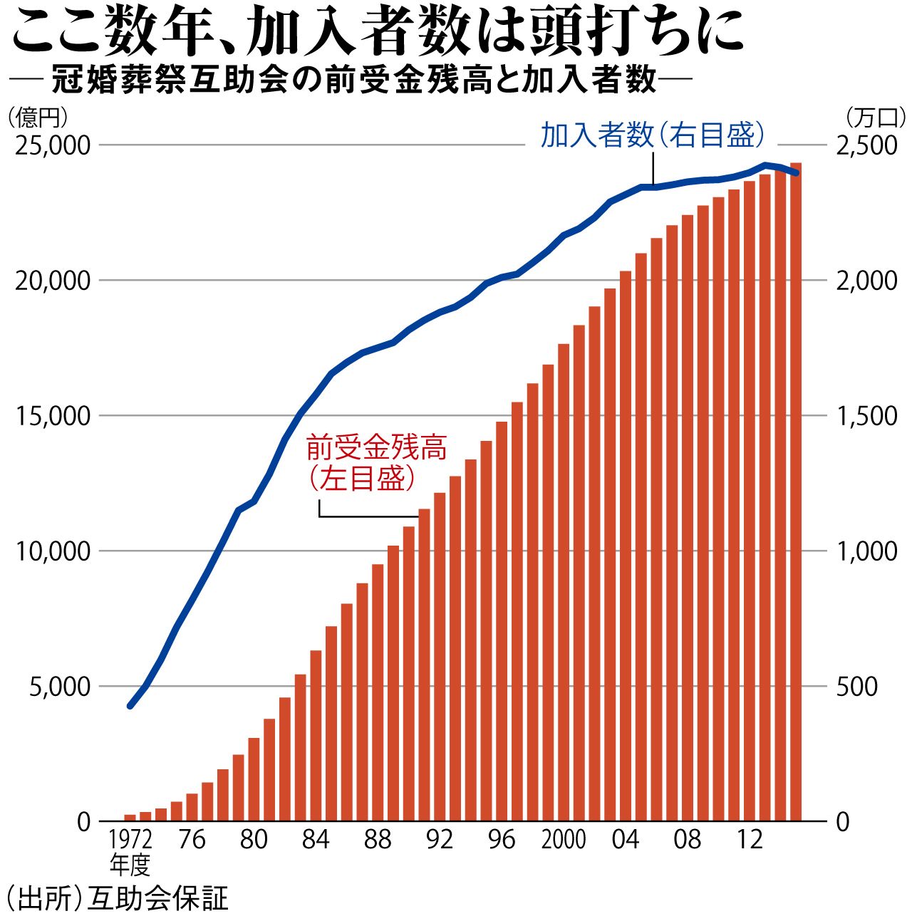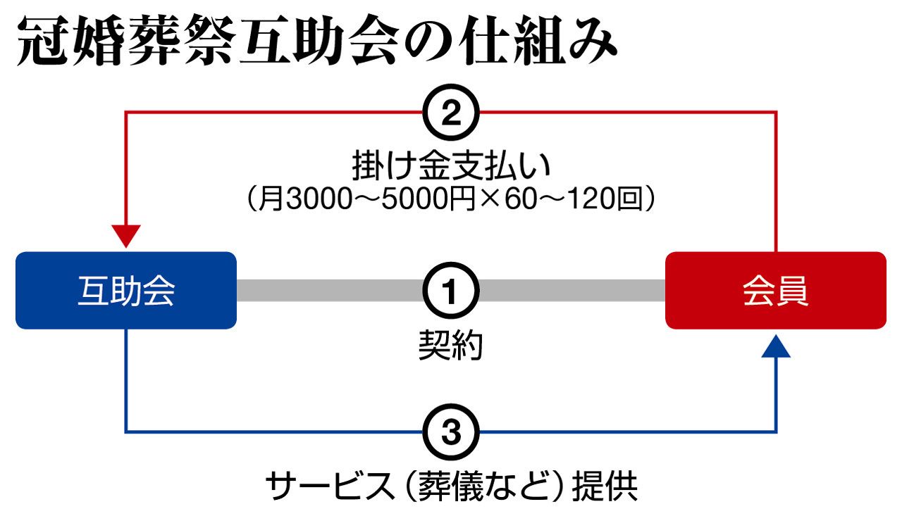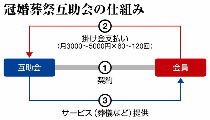 前もって受け取る掛け金を元手に、葬儀や結婚式などのサービスを提供する全国の「冠婚葬祭互助会」(互助会)。加入者数(口数)は約2400万、掛け金の総額は2兆4000億円に上り、葬儀市場のシェア5割超を占めるとみられる巨大業界だ。